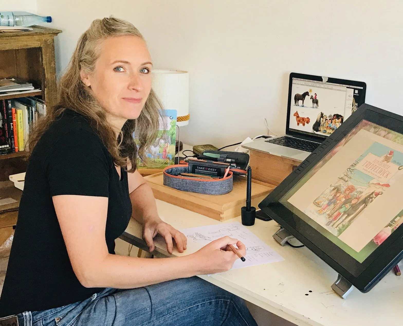 Mein Arbeitsplatz ist sehr schlicht. Ich sitze an einem Schreibtisch mit einem Computer und großem Grafiktablett. Das sind meine Werkzeuge für die Auftragsarbeiten. Alle Illustrationen, von der Skizze bis zum fertig kolorierten Bild entstehen digital. Vor mir ist eine große Pinwand mit Entwürfen zu Figuren, Bildern zur Inspiration und allerlei Notizen.